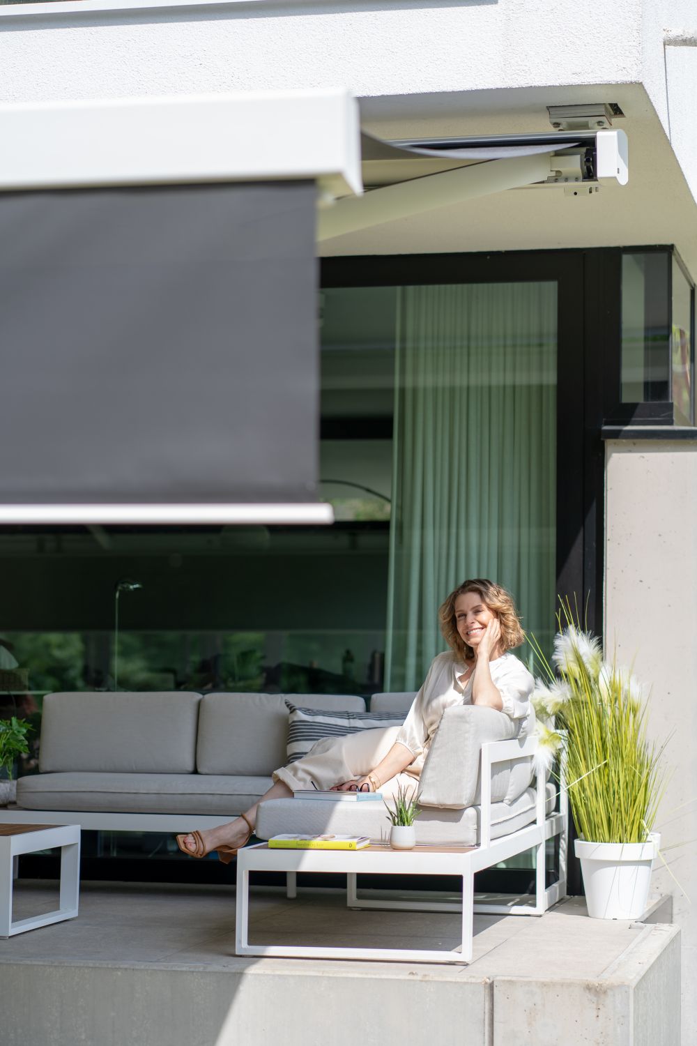 De luxueuze Cadiz heeft een robuuste traditionele vorm die degelijkheid uitstraalt. Dit scherm beschermt elk terras tegen overtollige hitte, jaar in, jaar uit.