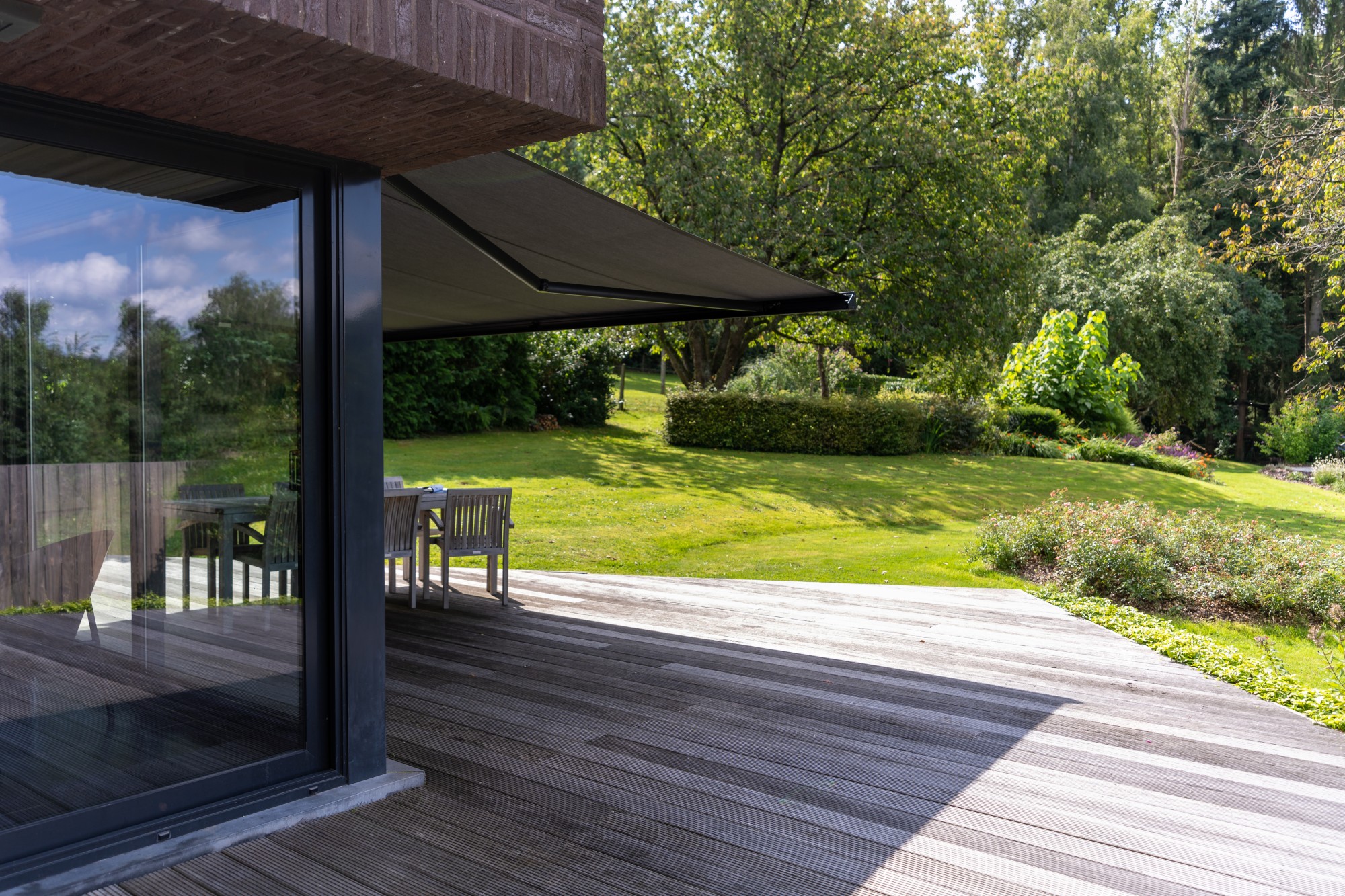 Tot een breedte van 6 meter voorzien we 2 knikarmen om het scherm open te plooien. Van 6 tot 7 meter wordt het scherm open geplooid met 3 knikarmen voor extra stevigheid. Je kan dit scherm ook koppelen, zo behaal je een maximale breedte van wel 12 meter in totaal.